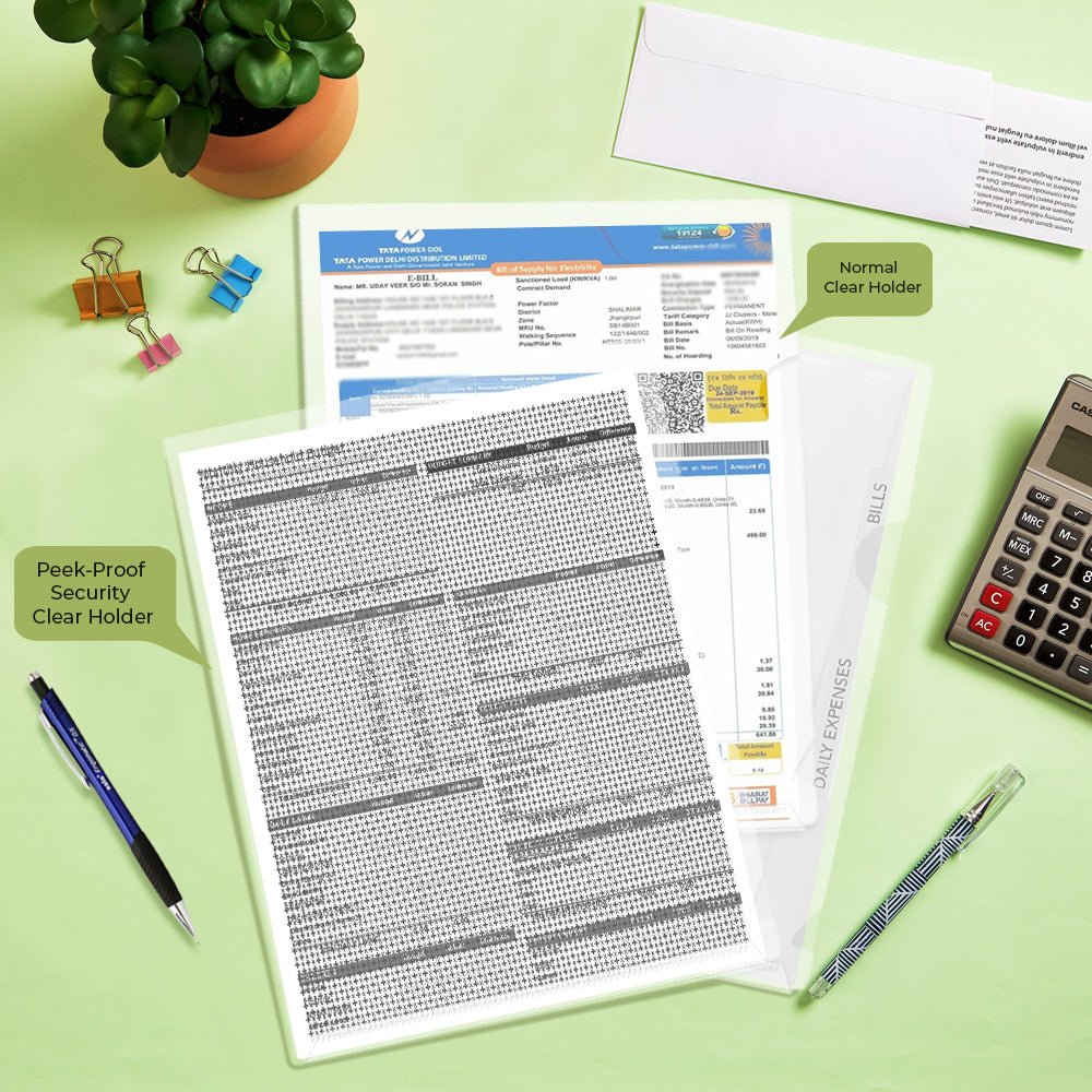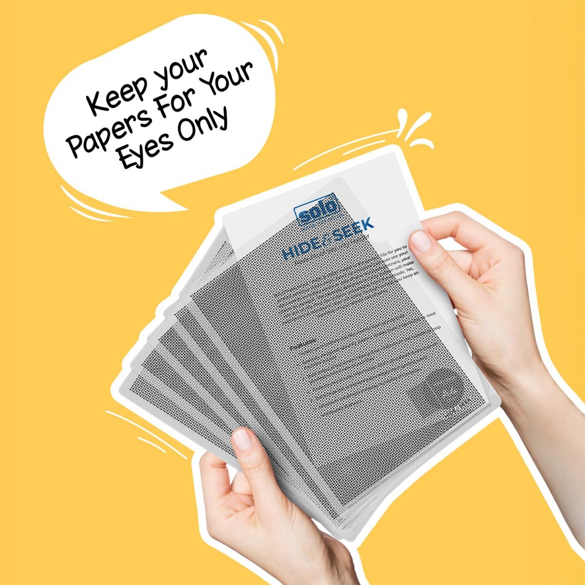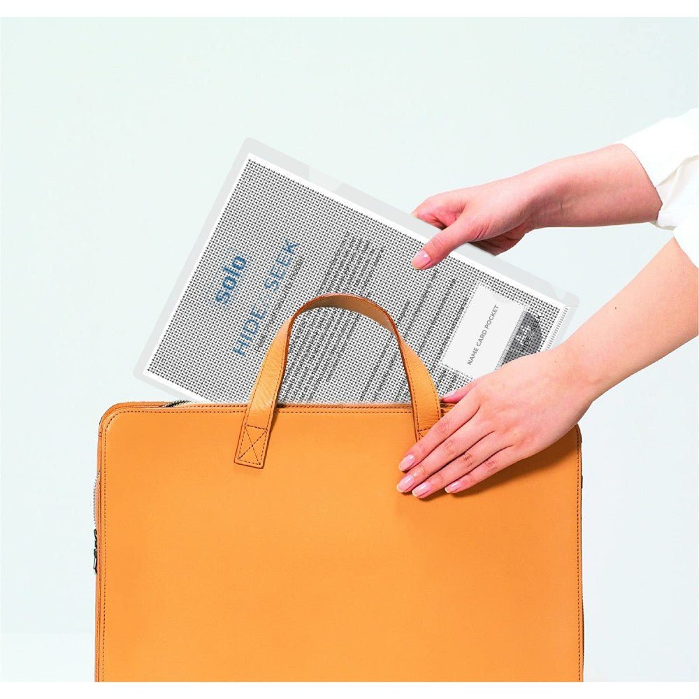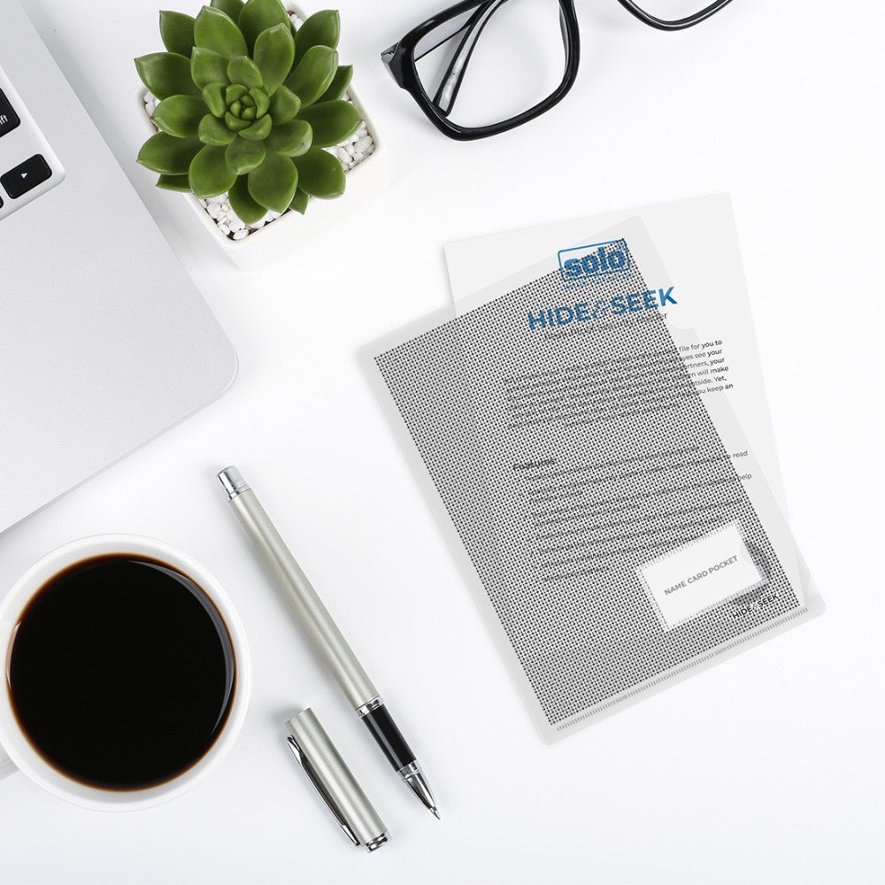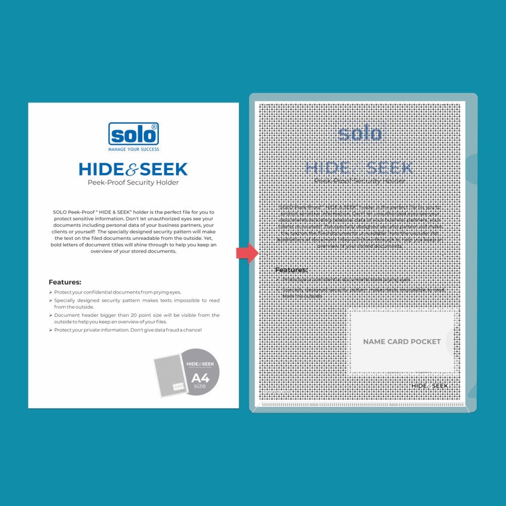 SOLO Peek-Proof “HIDE & SEEK” holder is the perfect file for you to protect sensitive information. Don’t let unauthorized eyes see your documents including personal data of your business partners, your clients or yourself! The specially designed security pattern will make the text on the filed documents unreadable from the outside. Yet, bold letters of document titles will shine through to help you keep an overview of your stored documents.