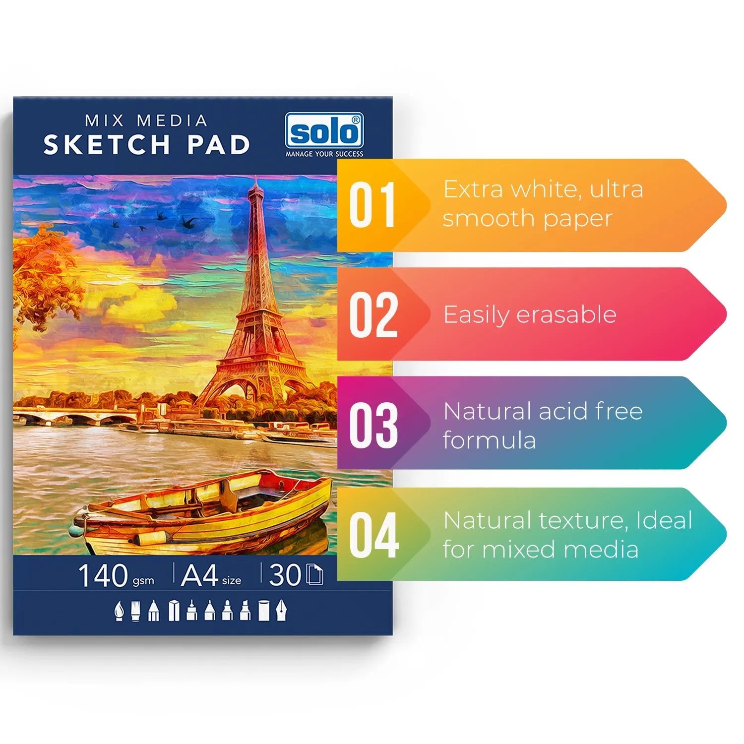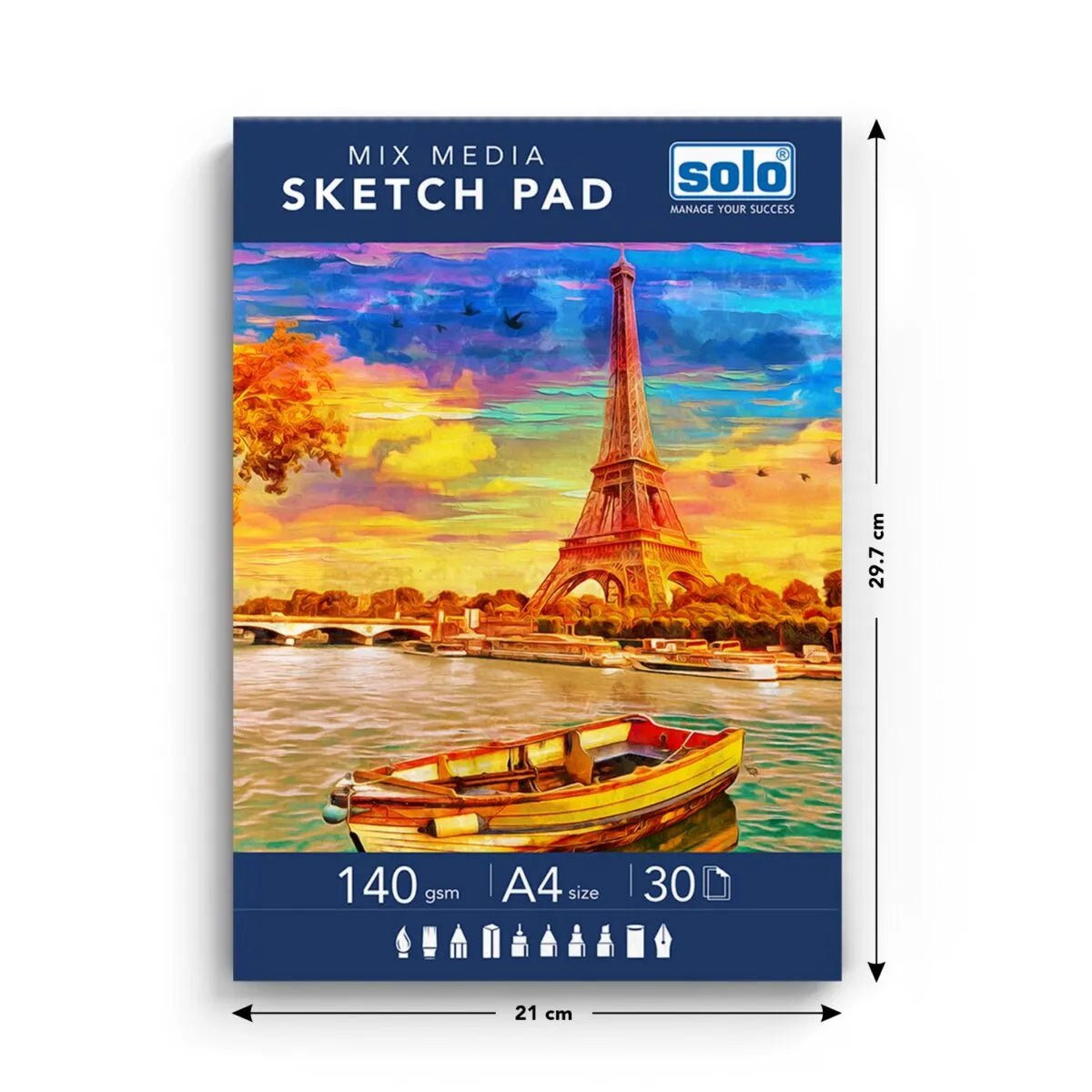 SOLO MIX MEDIA SKETCHPAD SPECIFICATION: Your artistry with Solo mix media sketchpad or drawing/sketch book set, featuring 50 pages catering to artists of all levels. Each spiral-bound artbook boasting 50 acid-free pages of 140 gsm heavyweight paper. Sized at 21×29.7cm (A4), it’s perfect art material for sketching, drawing, and painting with a variety of mediums such as pencils, markers, paints, watercolor and pens.